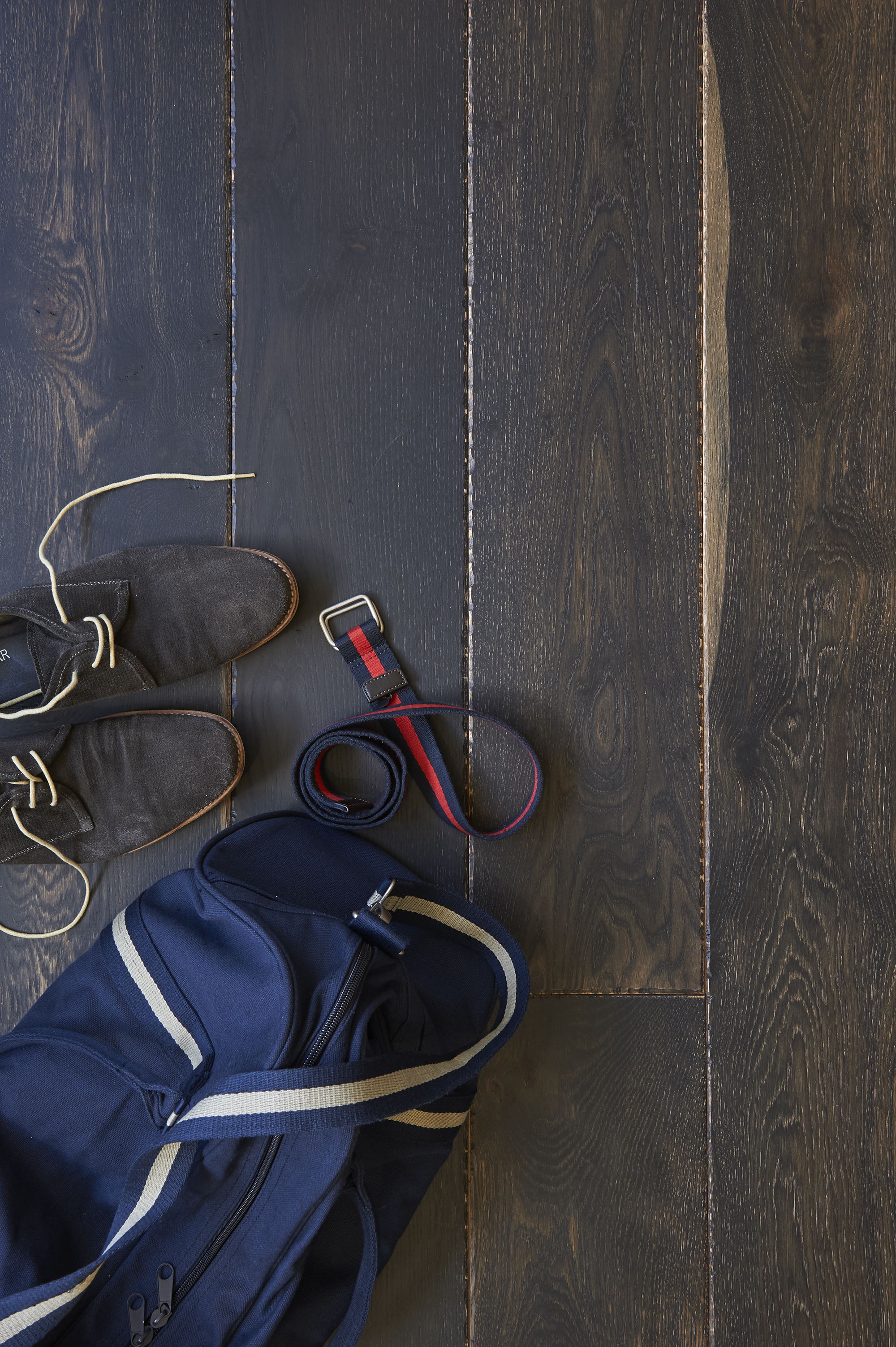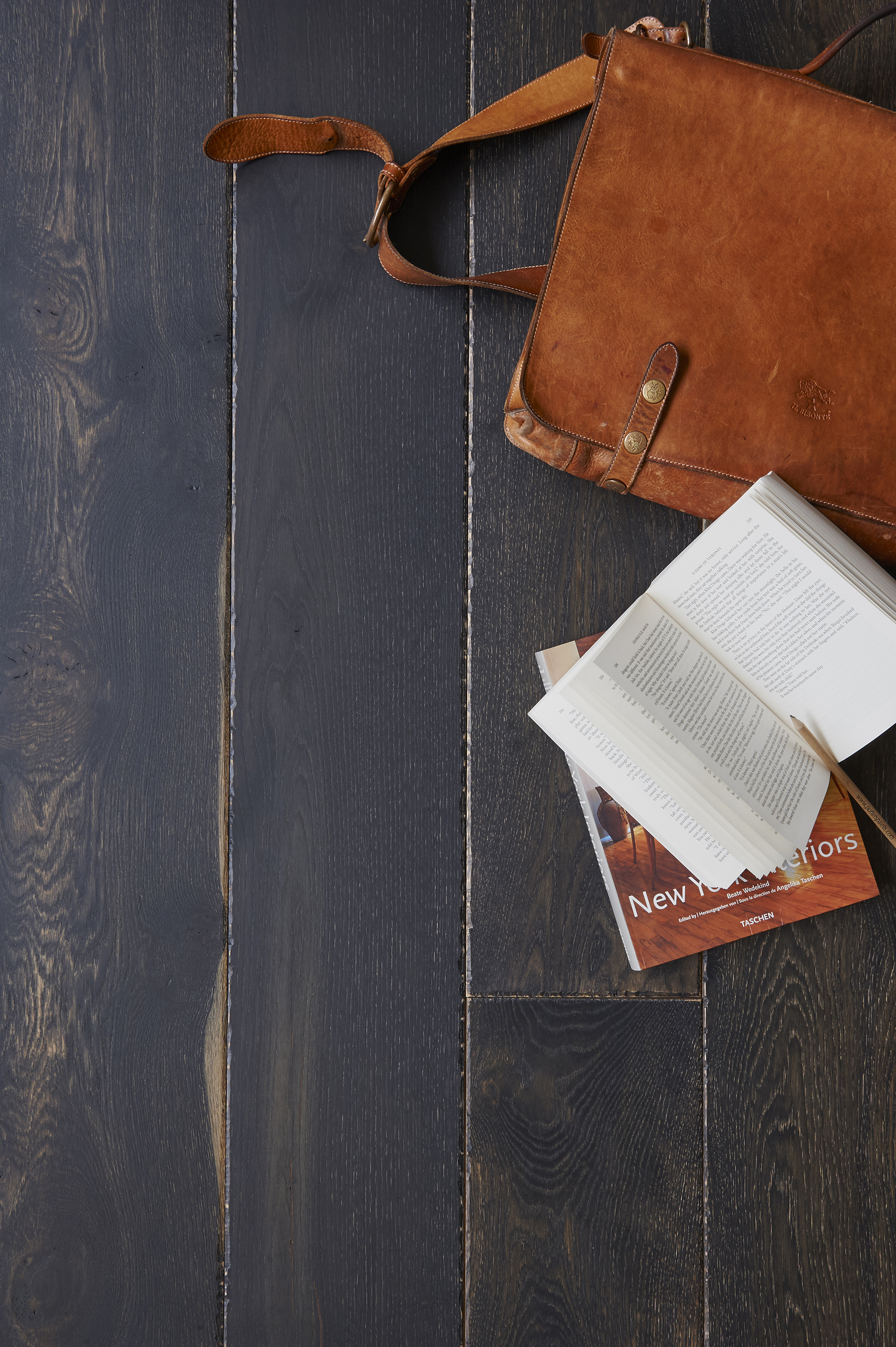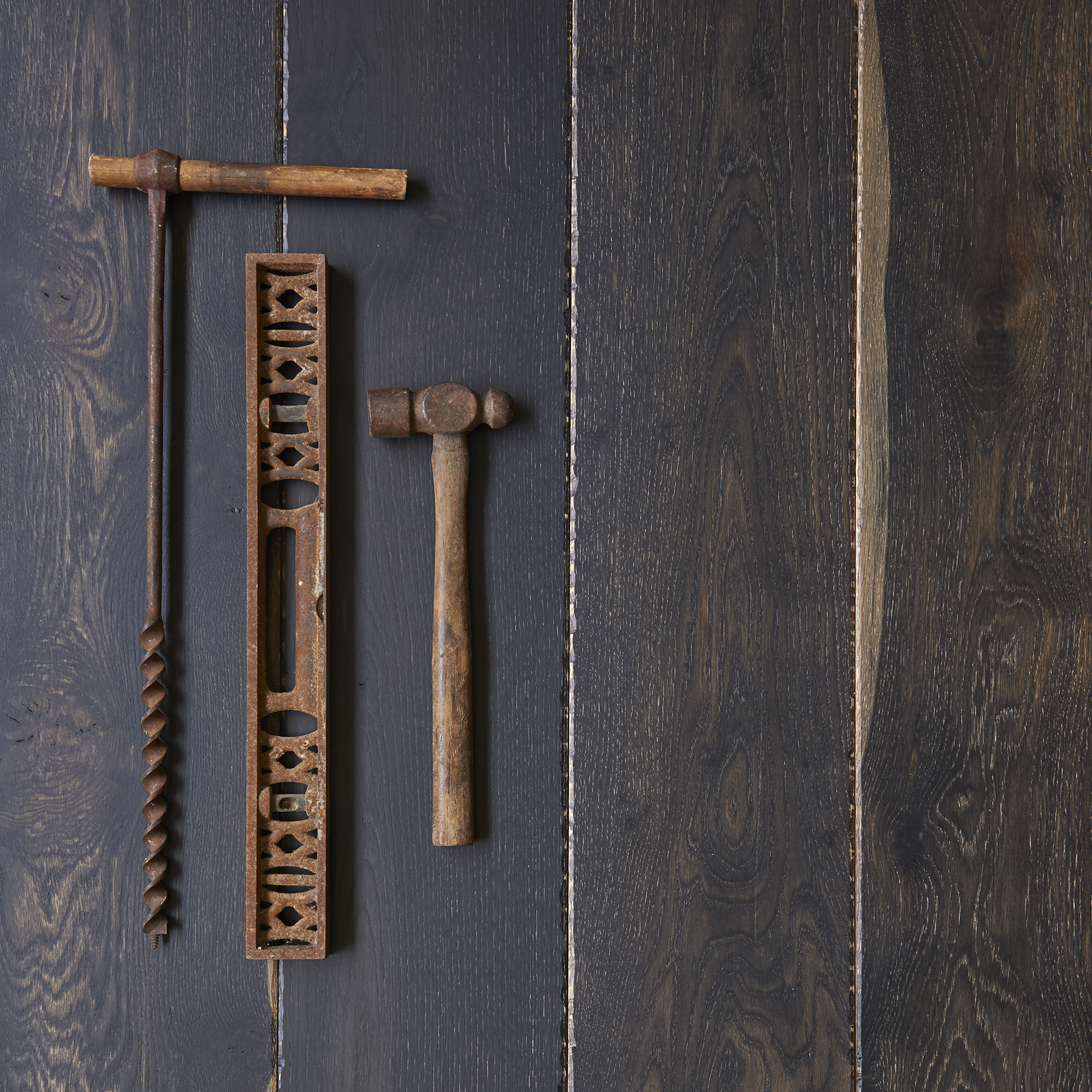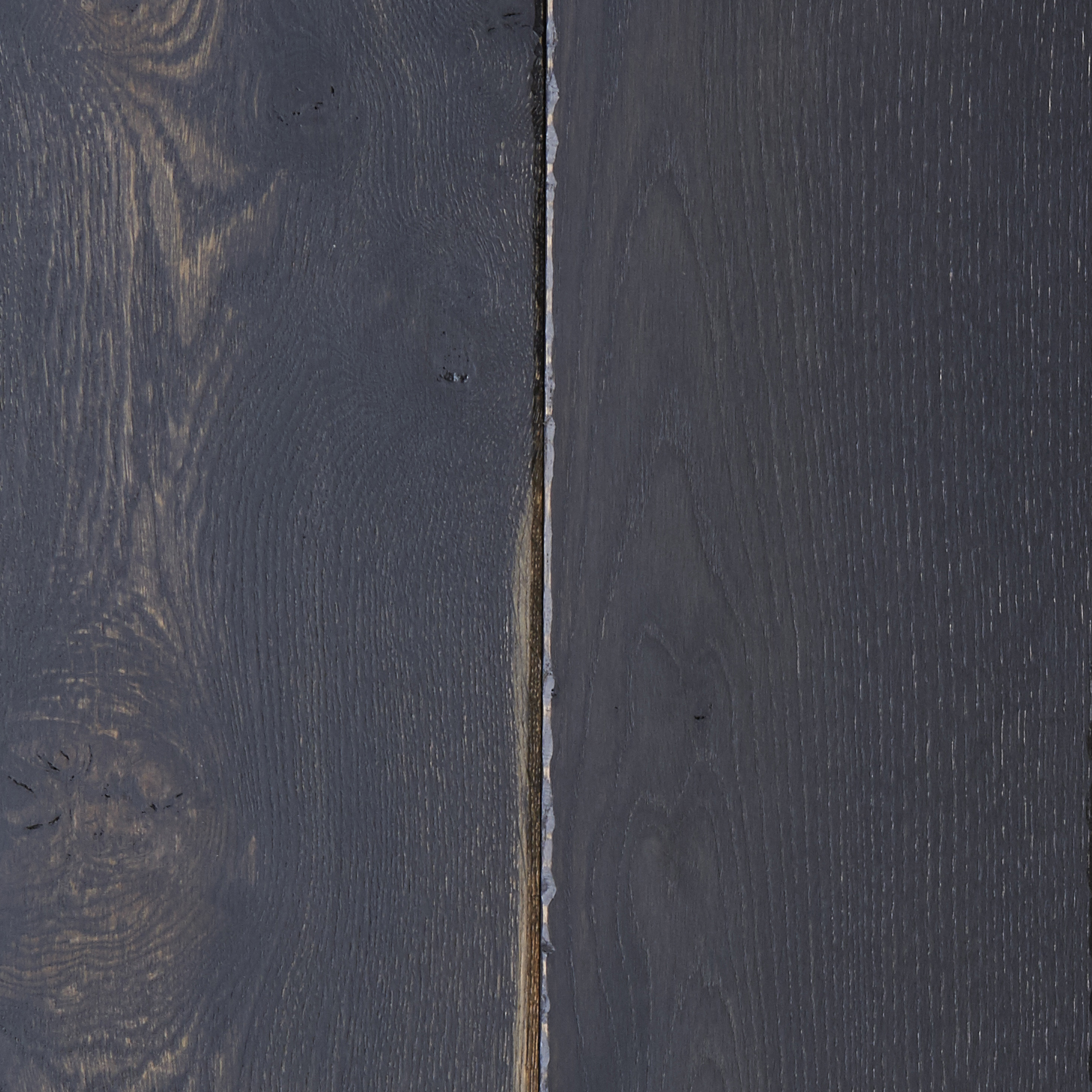 A country style board stained to a deep charcoal with a hand finished rustic edge