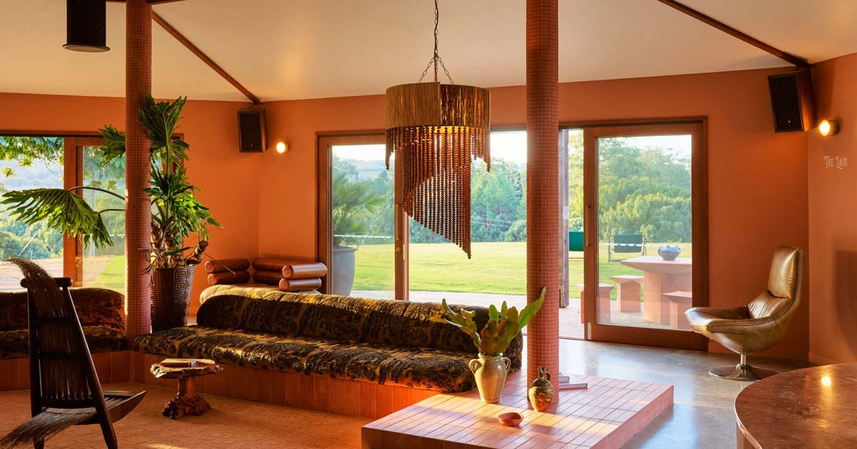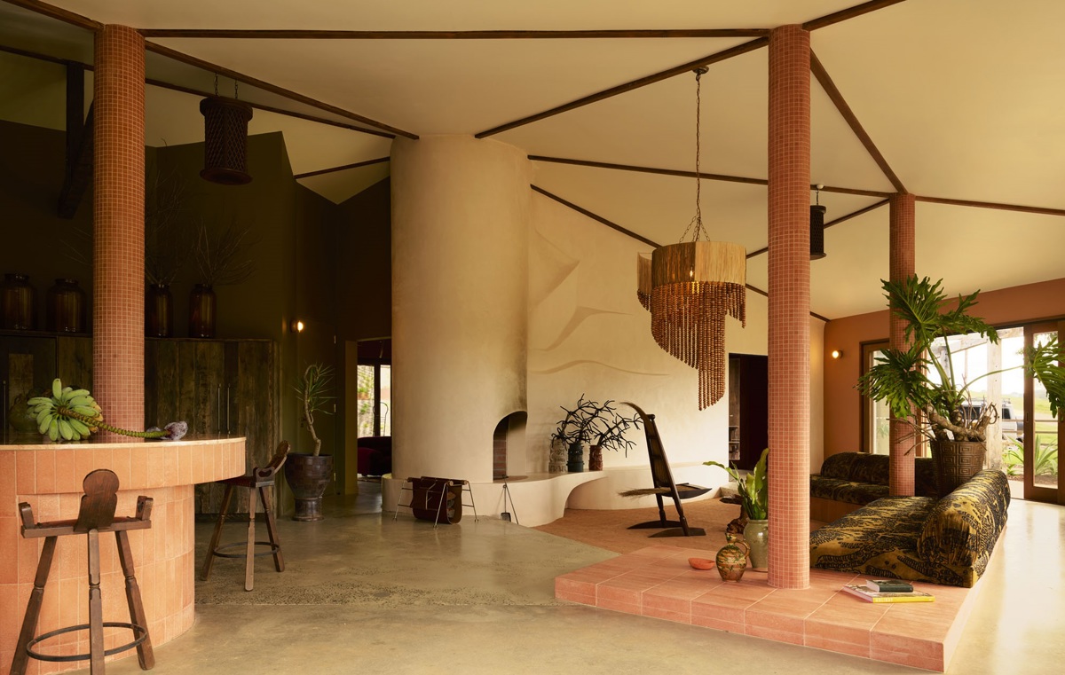 "Our interiors are a creative conversation: spiral Italian terracotta lines the floor, tiger velvet upholstery graces the sunken lounge surrounding a huge sculptural fireplace." Julia Ashwood