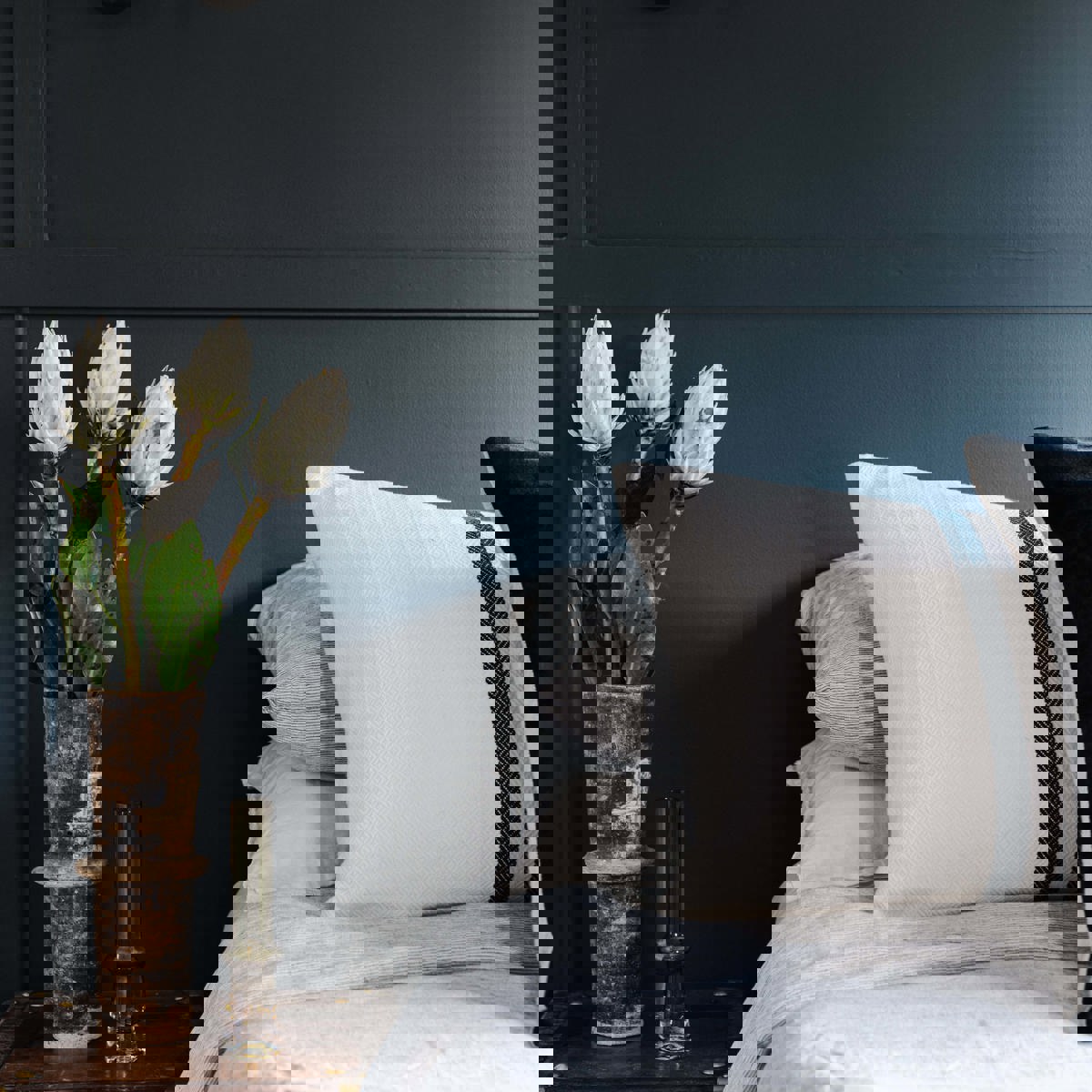 Popcorn, the perfect classic natural white has been used in the living room and hallway. Beyond the doorway is the main bedroom featuring the rich moody colour North Sea.